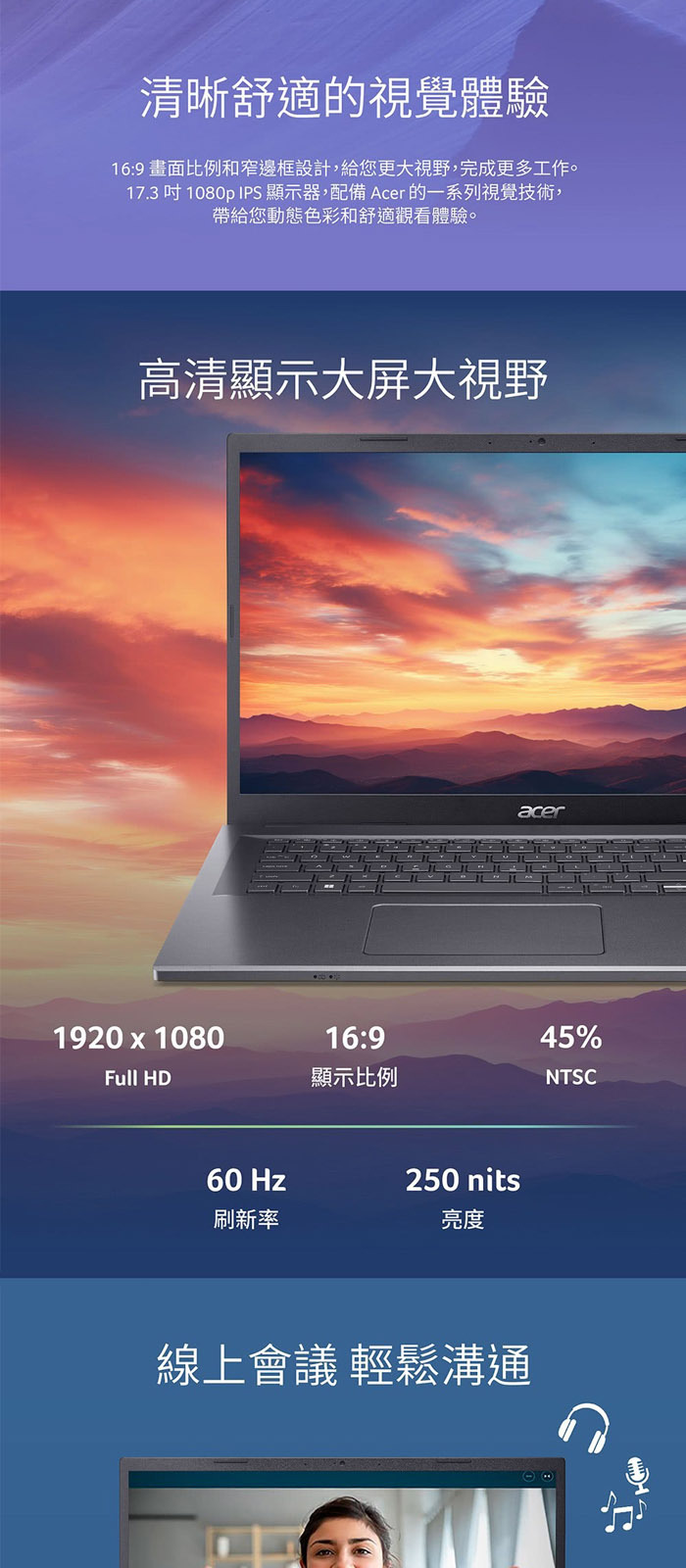 ●螢幕:17.3"/IPS/霧面/LED背光/FHD 1920 x 1080/NTSC 45%/ 250 nits