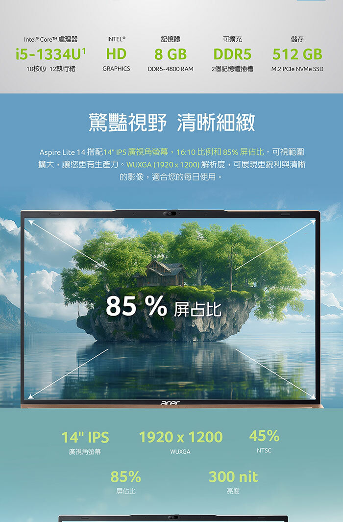●螢幕尺寸:14.0" IPS/16:10/霧面/LED背光 WUXGA 1920 x 1200 NTSC 45% 300 nits