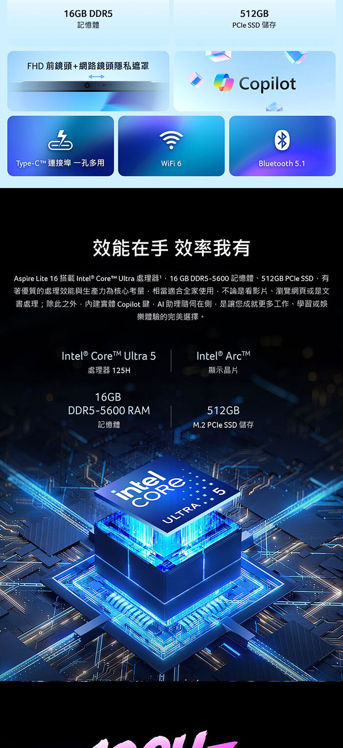 ●處理器:IntelR Core? Ultra 5 processor 125H 14核心/18緒 1.2GHz 超頻 4.5GHz / 18M Cache