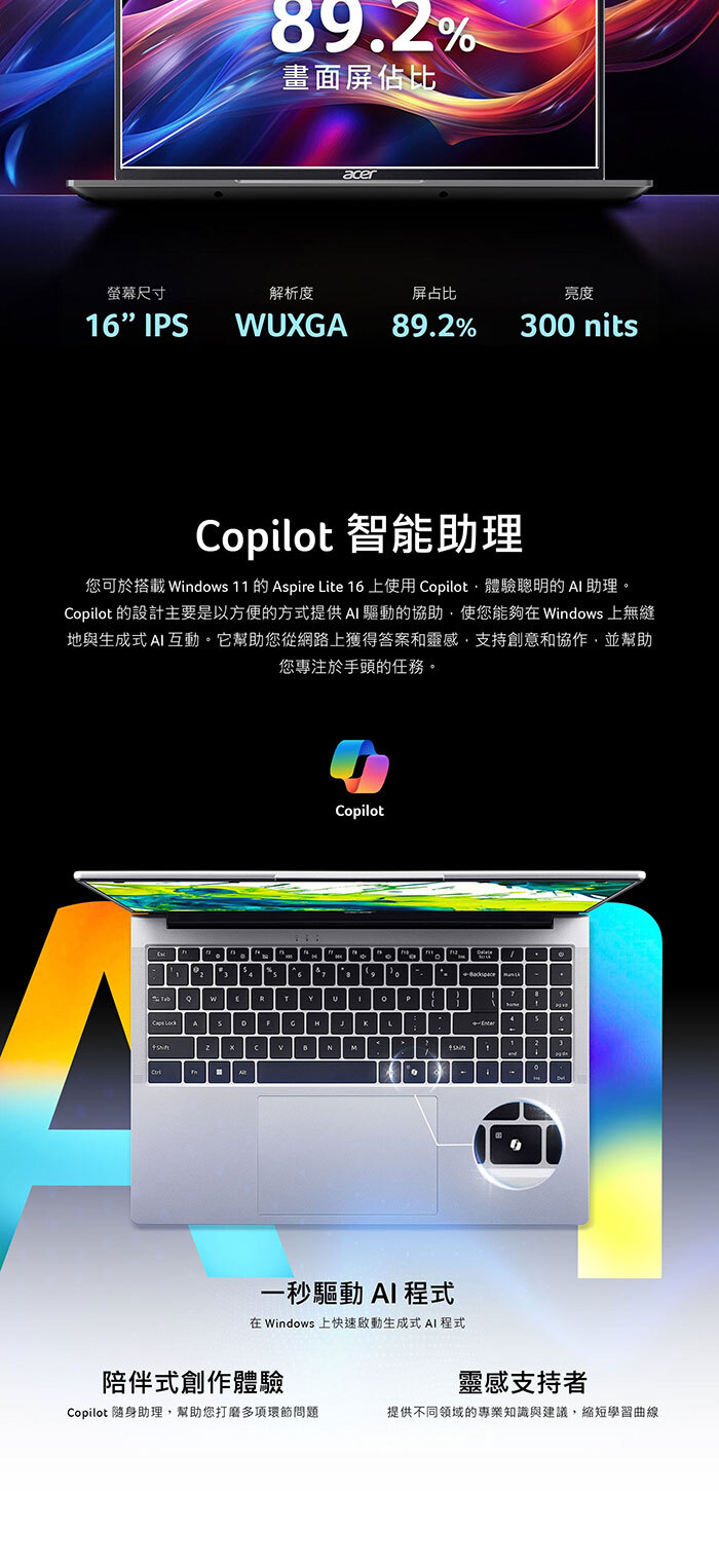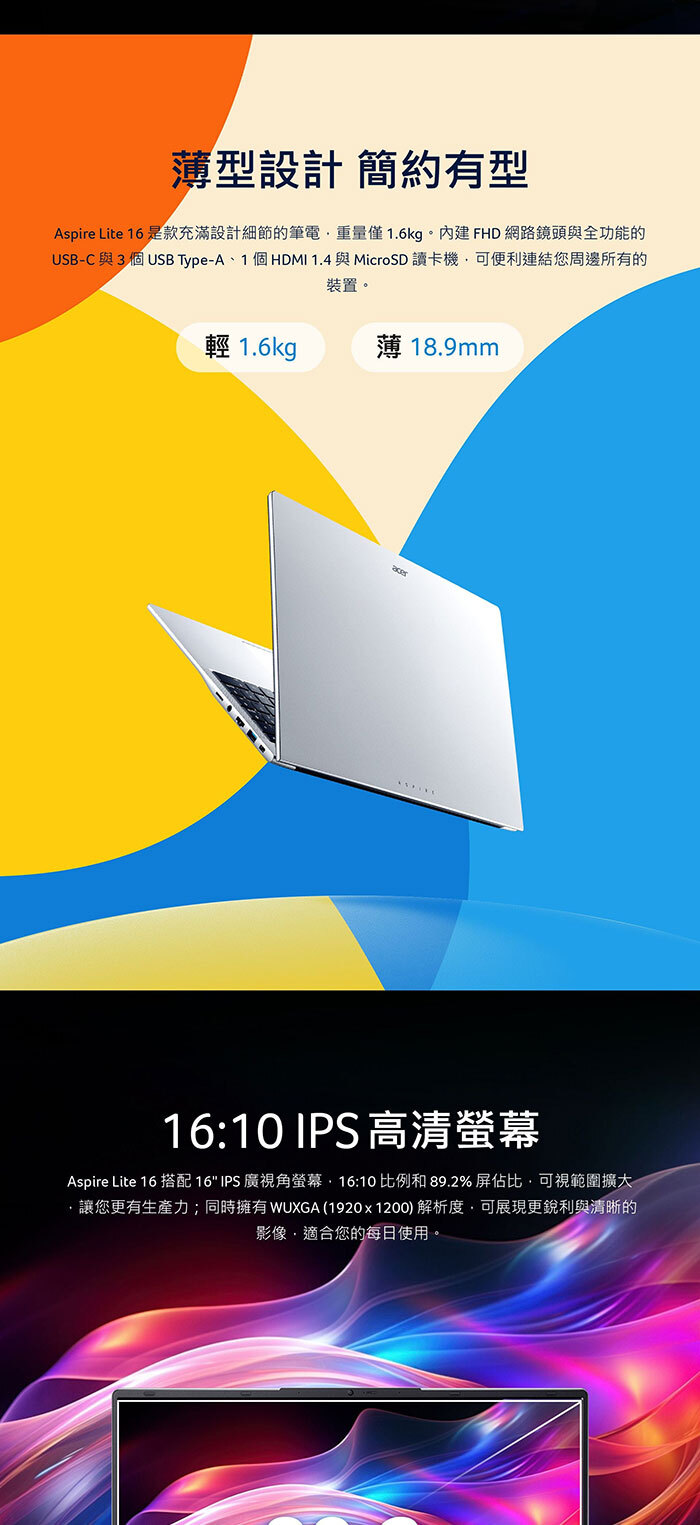 ●螢幕:16.0" IPS/16:10/霧面/LED背光 WUXGA 1920 x 1200 NTSC 45% 300 nits
