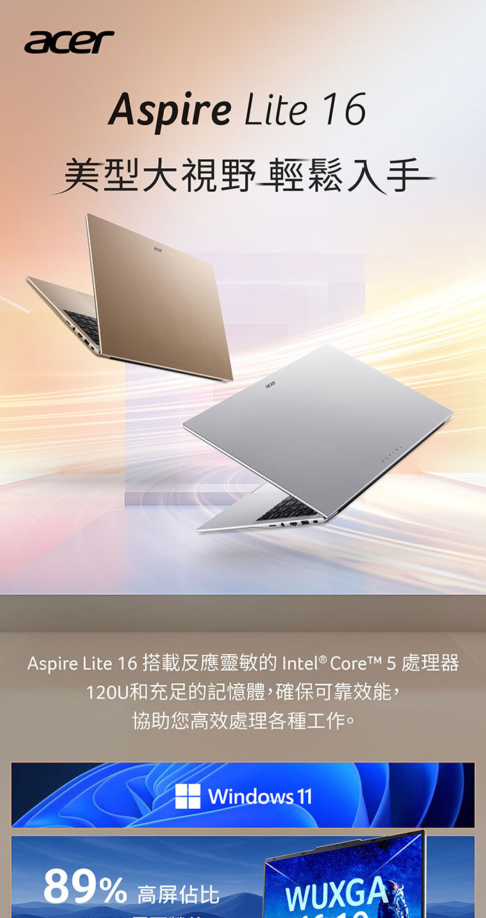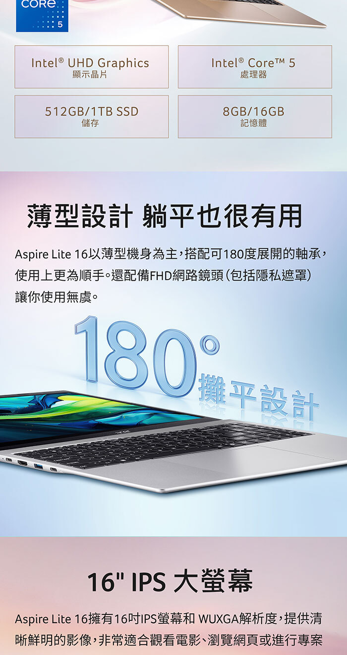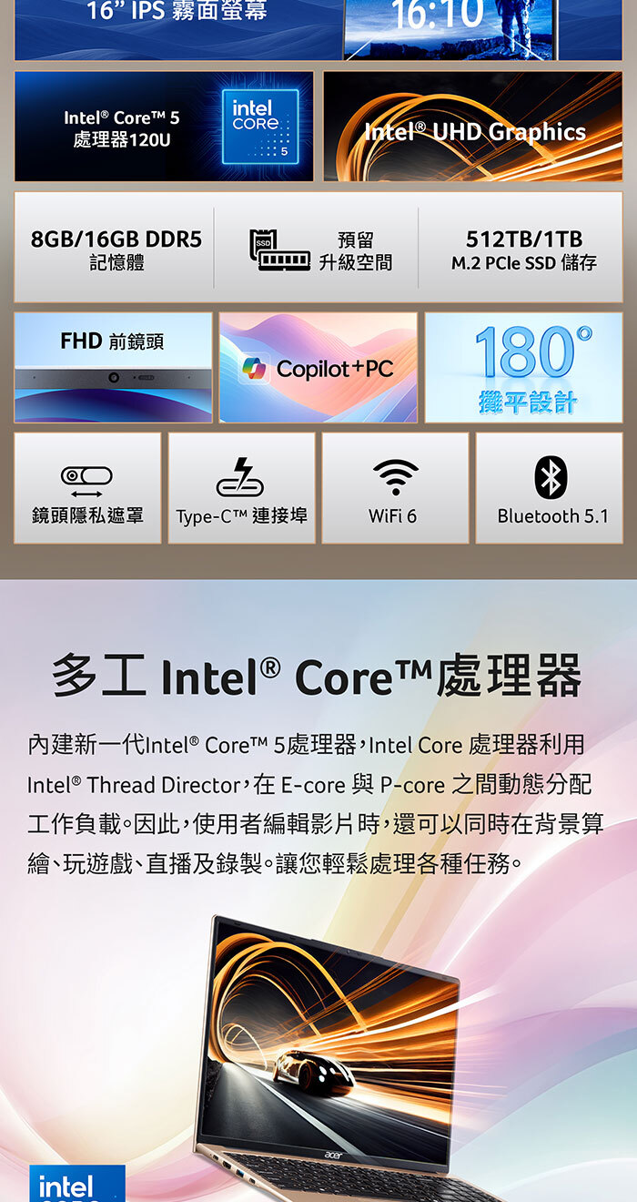 ●處理器:IntelR Core? 5 處理器 120U(12M 快取記憶體,最高可達 5.00 GHz)