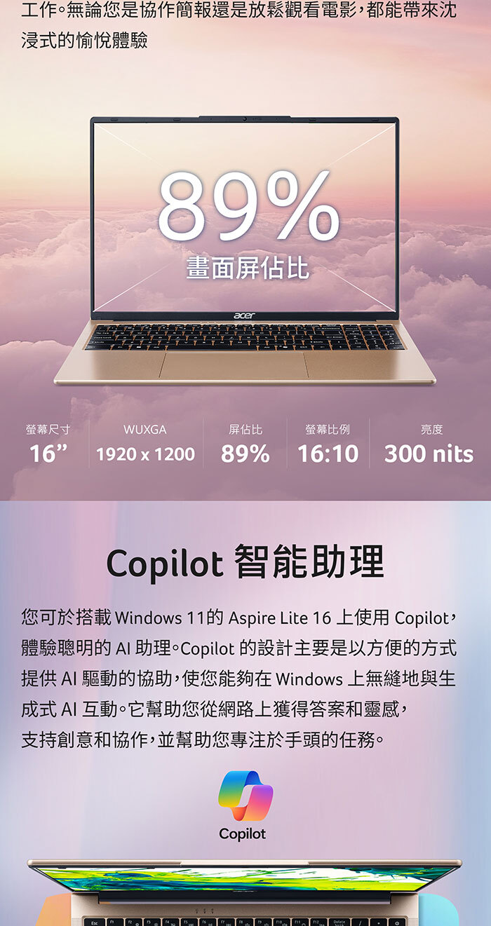 ●螢幕尺寸:16" 16:10/IPS/霧面/LED背光 解析度:WUXGA 1920 x 1200 色域:NTSC 45% 亮度:300 nits