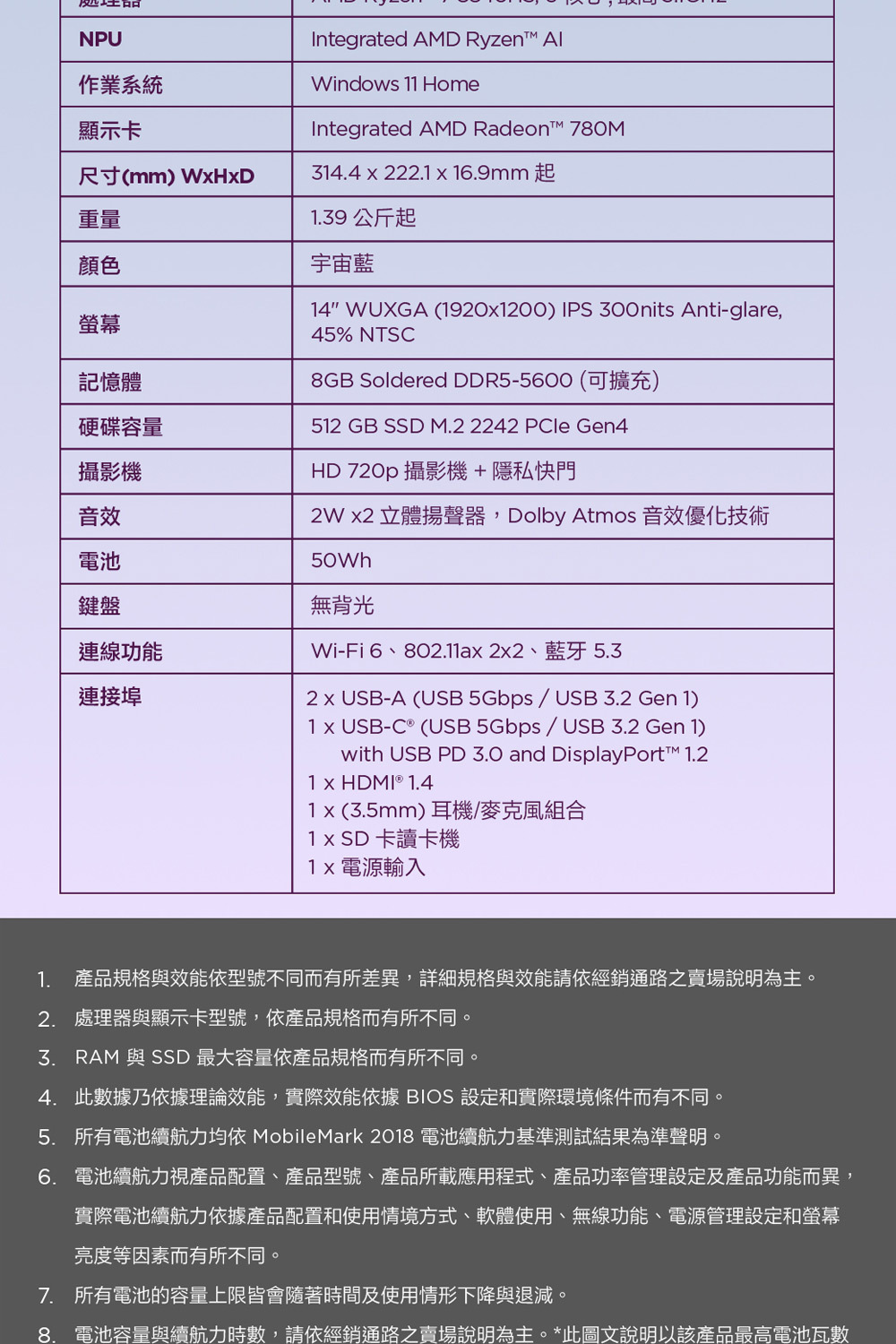 ●處理器:AMD Ryzen™ 7 8840HS 八核心