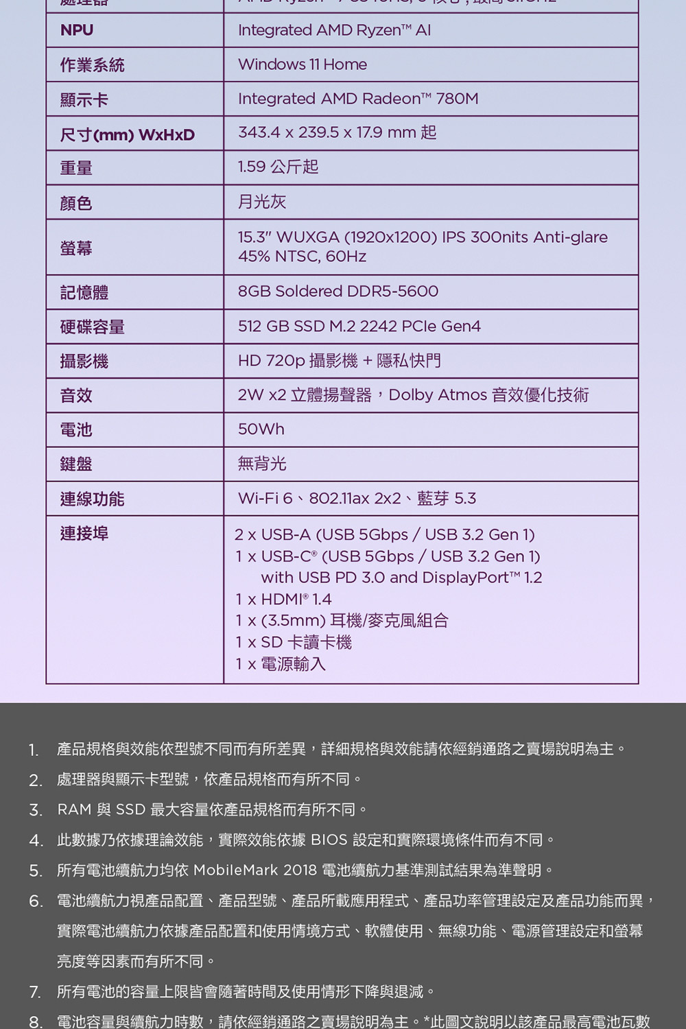 ●處理器:AMD Ryzen™ 7 8840HS (8C / 16T, 3.3 / 5.1GHz, 8MB L2 / 16MB L3)