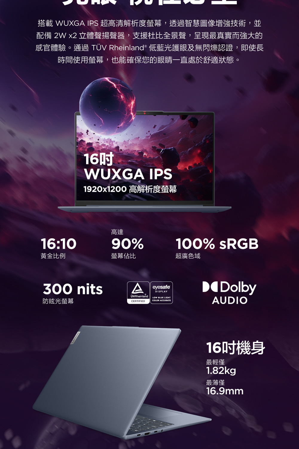 ●螢幕尺寸:16" WUXGA (1920x1200) IPS 300nits Anti-glare, 100% sRGB, 60Hz