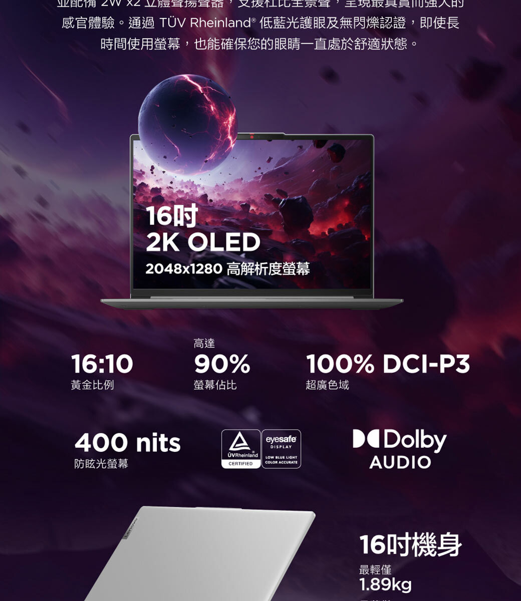 ●螢幕尺寸:16" 2K (2048x1280) OLED 400nits Glossy, 100% DCI-P3, 120Hz, DisplayHDR™ True Black 500