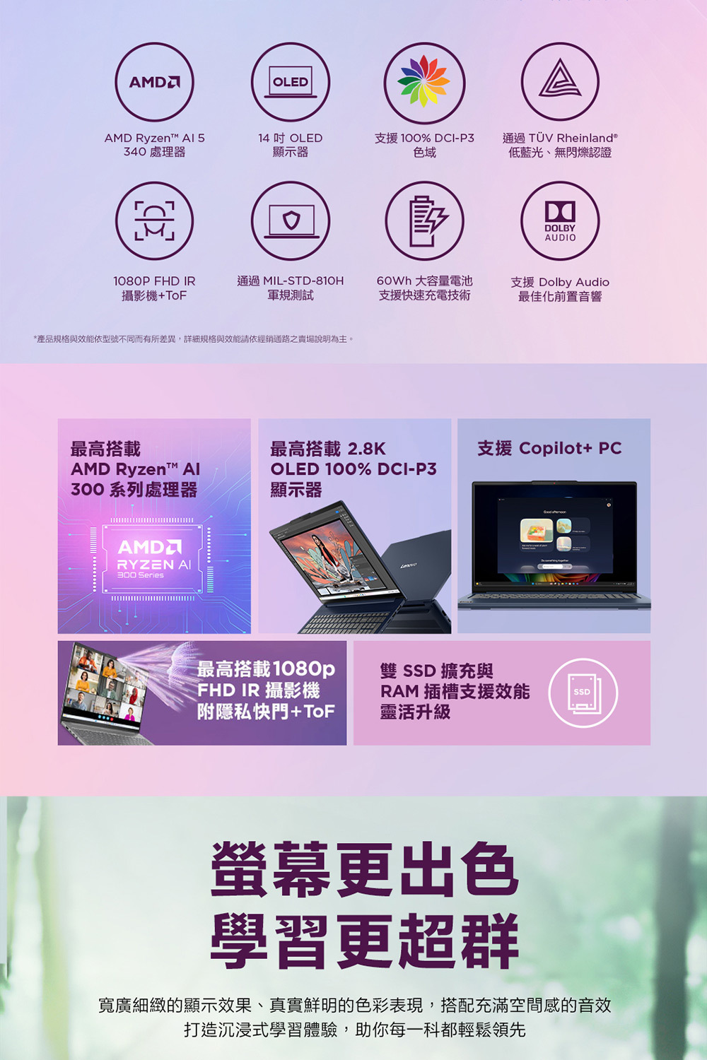 ●螢幕尺寸:14" WUXGA (1920x1200) OLED 400nits Glossy, 100% DCI-P3, DisplayHDR™ True Black 500