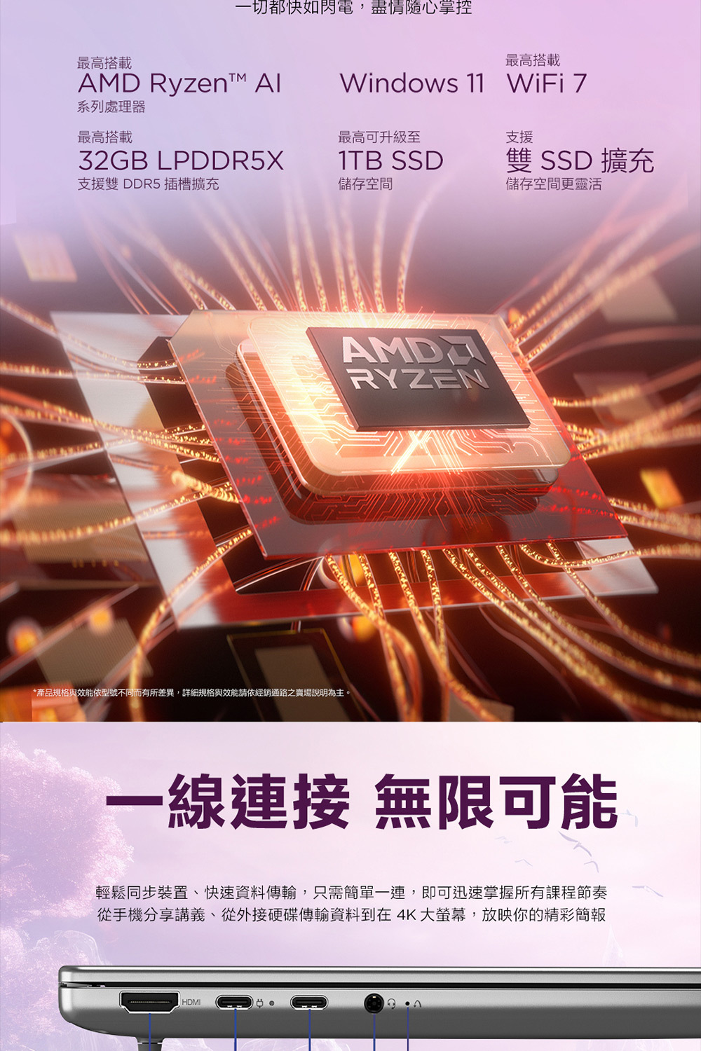 ●處理器:AMD Ryzen™ AI 7 350 (8C / 16T, 2.0 / 5.0GHz, 8MB L2 / 16MB L3)