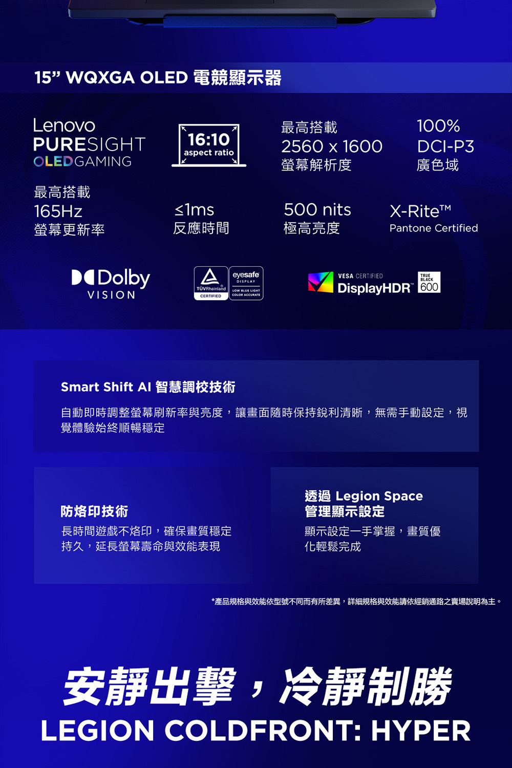 ●螢幕尺寸:15.1" WQXGA (2560x1600) OLED 500nits glossy, 100% DCI-P3, 165Hz, Dolby Vision®, DisplayHDR™ True Black 600