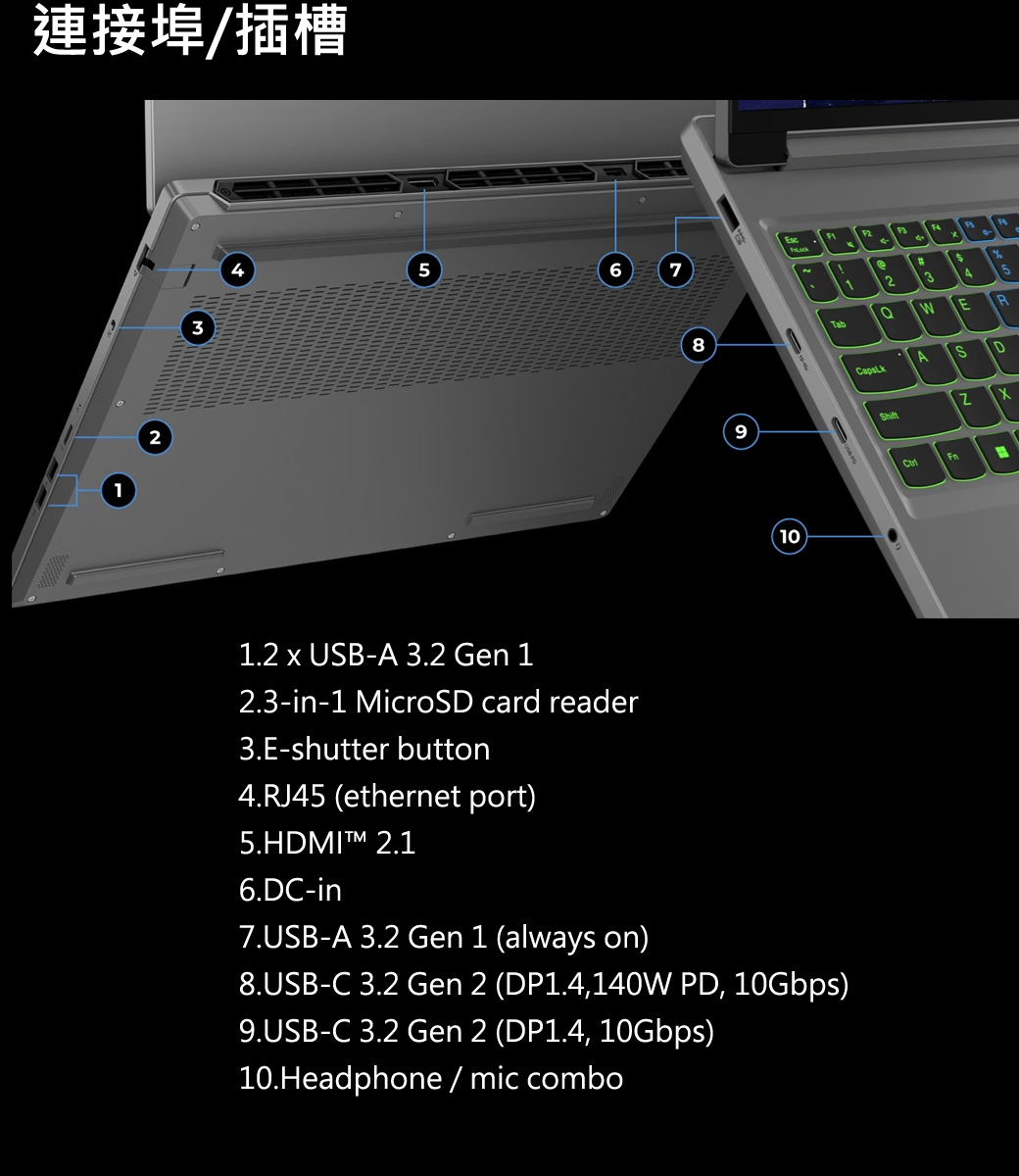 1x USB-C® (USB 10Gbps / USB 3.2 Gen 2), with Lenovo® PD 140W and DisplayPort™ 1.4