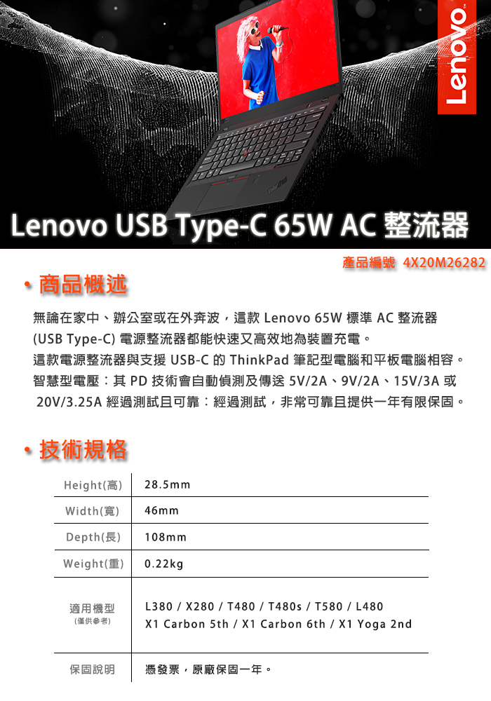 ●Lenovo 65W USB Type-C AC Adapter (4X20M26282)