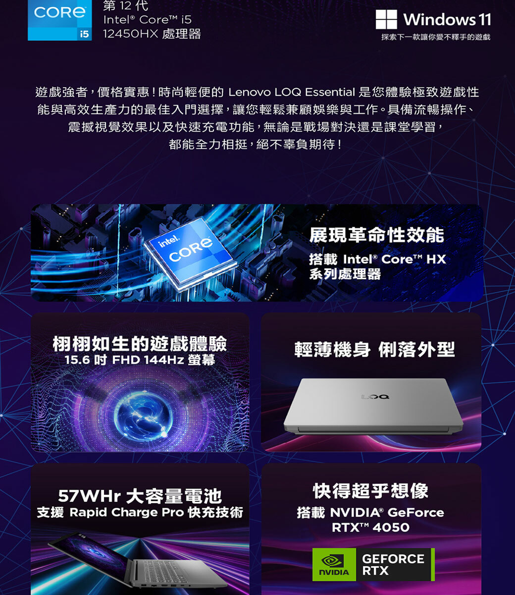 ●處理器:Intel® Core™ i5-12450HX, 8C (4P + 4E) / 12T, P-core up to 4.4GHz, E-core up to 3.1GHz, 12MB