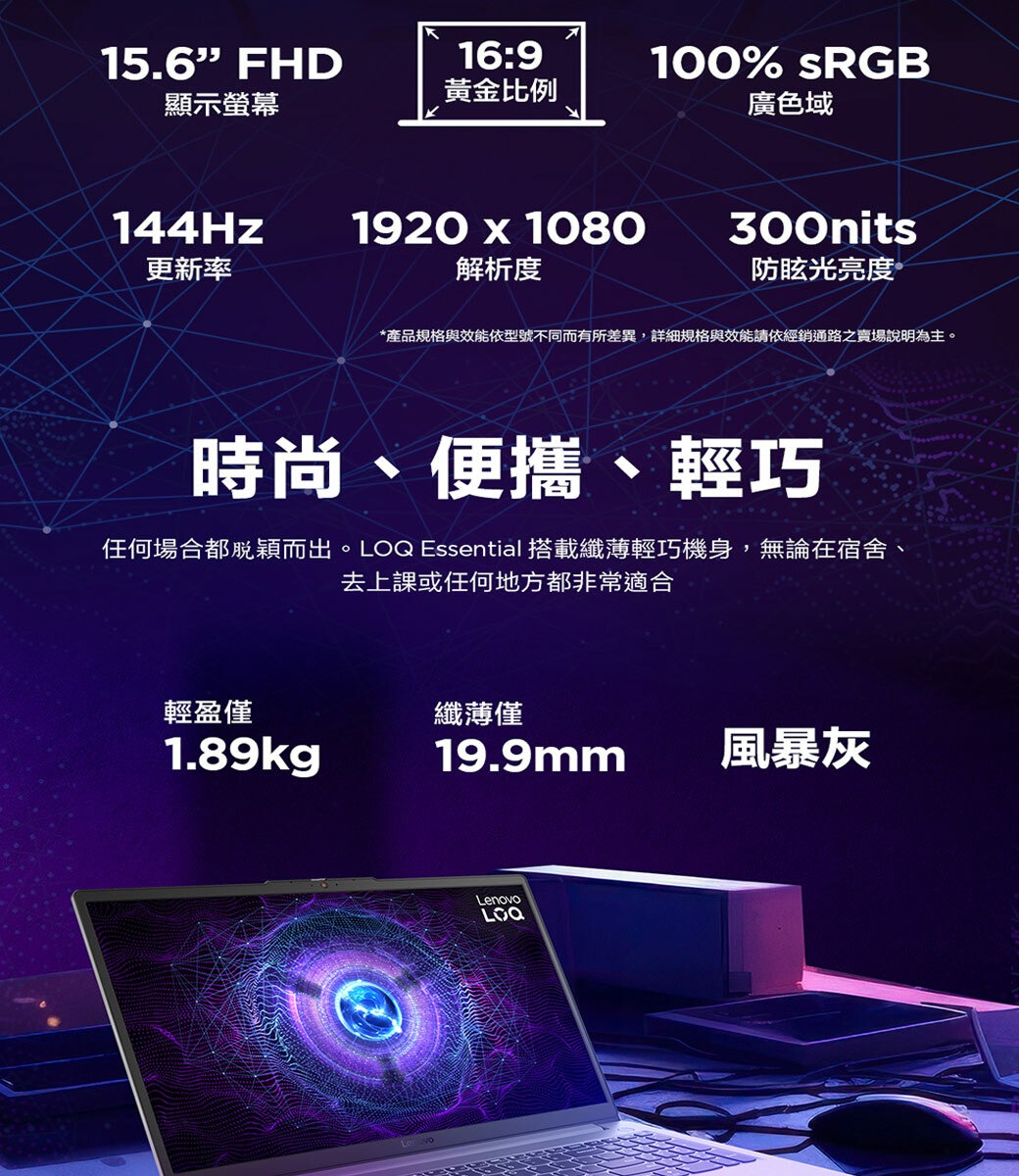 ●螢幕尺寸:15.6" FHD (1920x1080) IPS 300nits Anti-glare, 100% sRGB, 144Hz