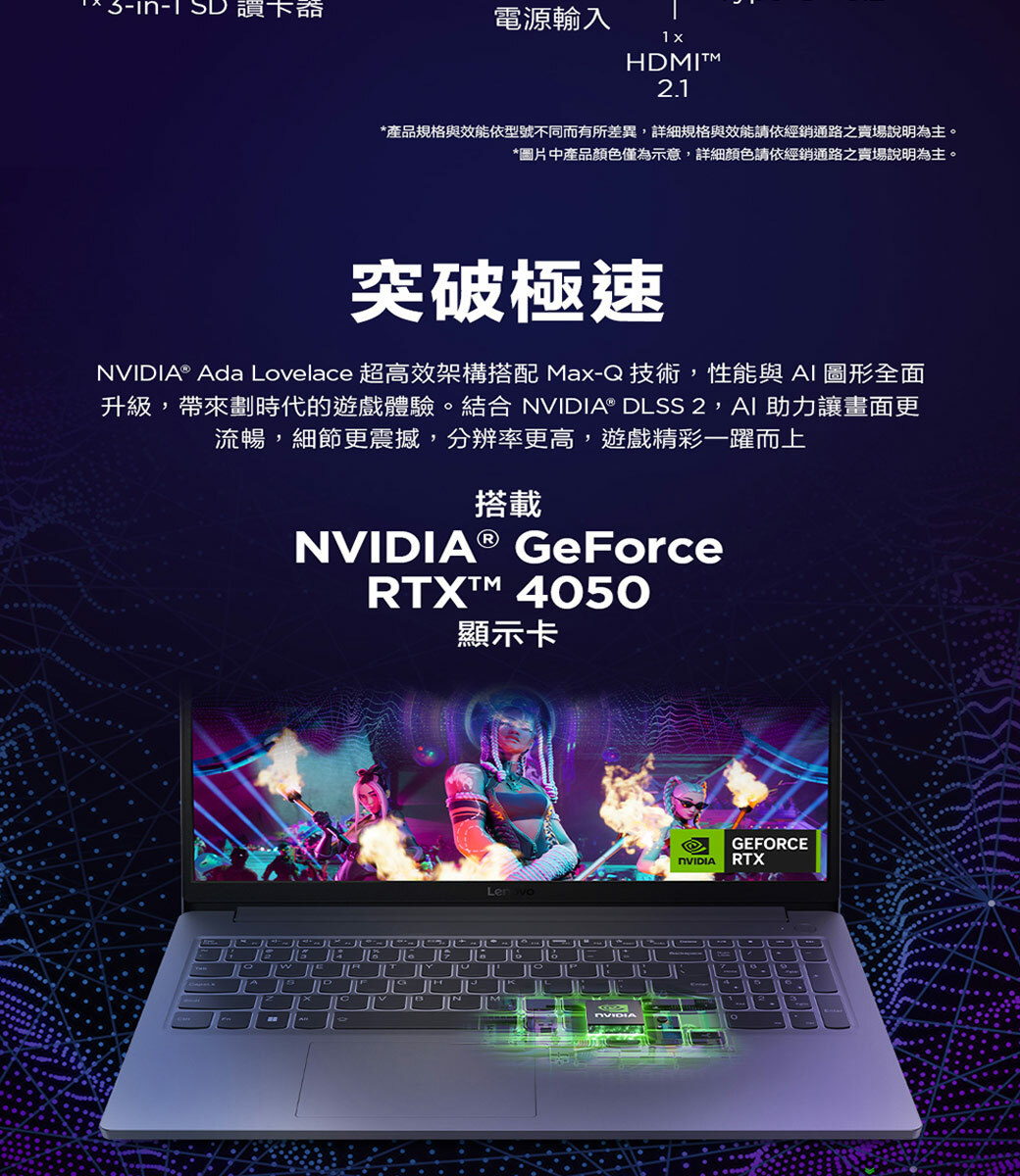 ●顯示卡:NVIDIA® GeForce RTX™ 4050 6GB GDDR6, Boost Clock 2145MHz, TGP 65W, 194 AI TOPS
