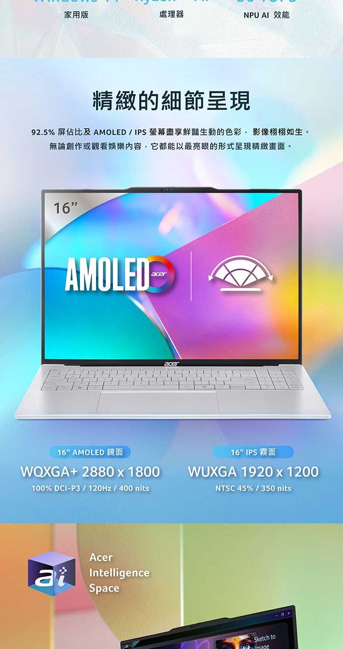 ●螢幕:16" 16:10/60~120Hz/OLED/鏡面 WQXGA+ 2880 x 1800 DCI-P3 100% 400 nits
