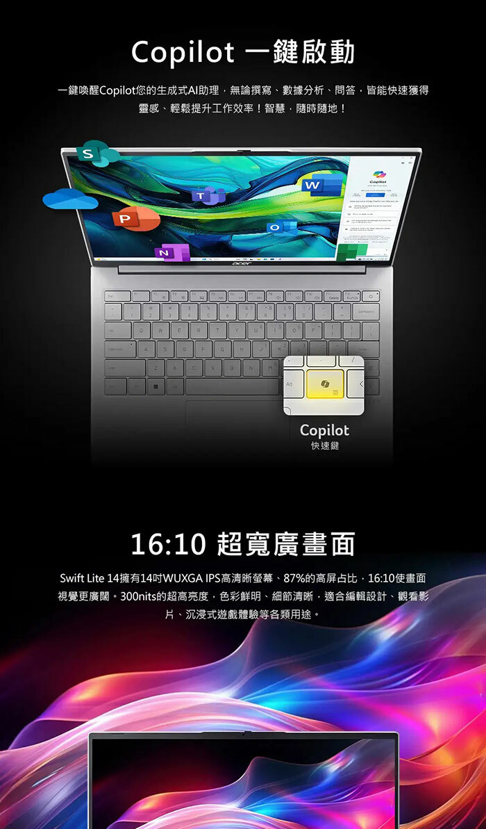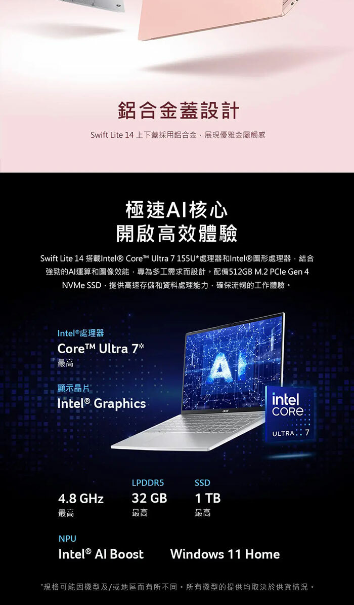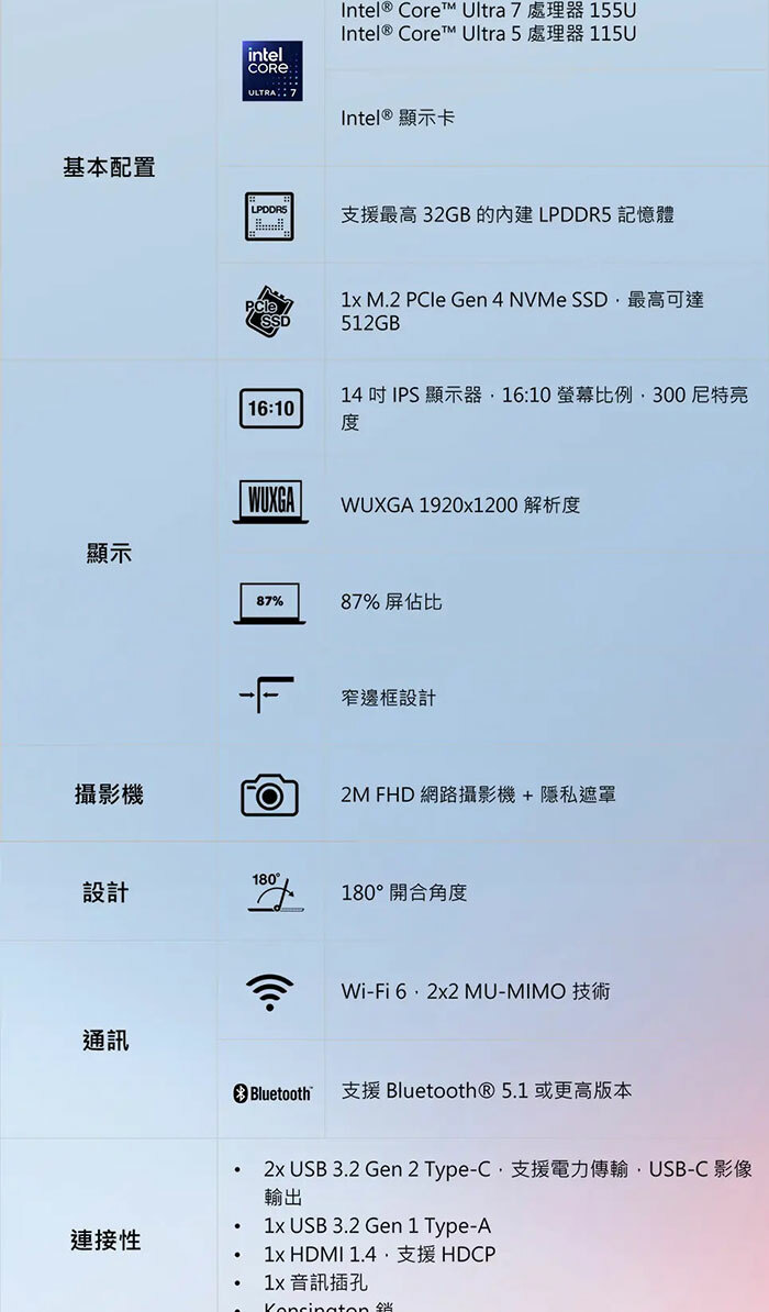 ●處理器:IntelR Core? Ultra 7 processor 155U 12核心/14緒 1.7GHz 超頻4.8GHz / 12M Cache