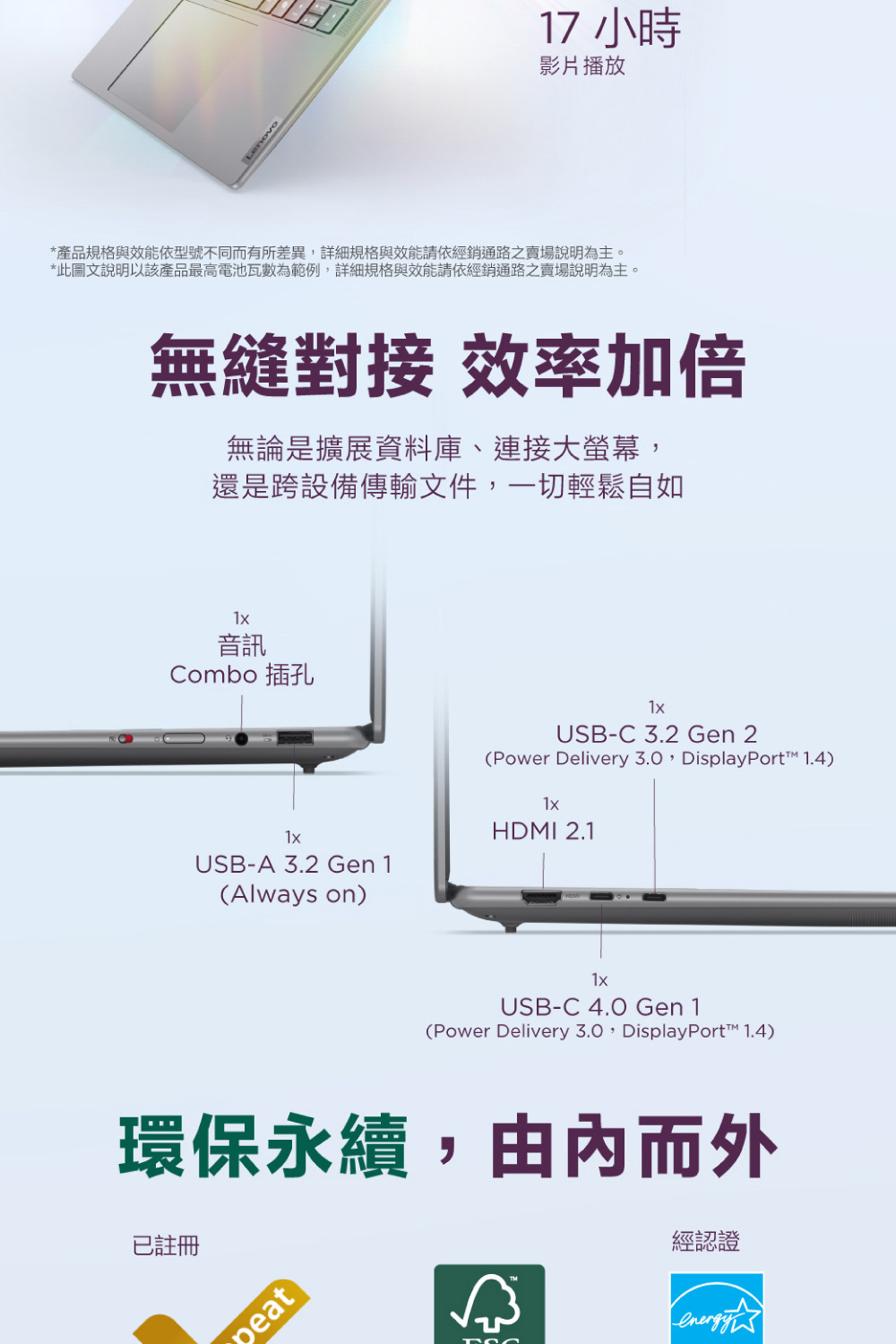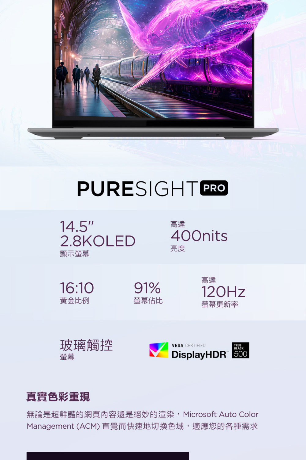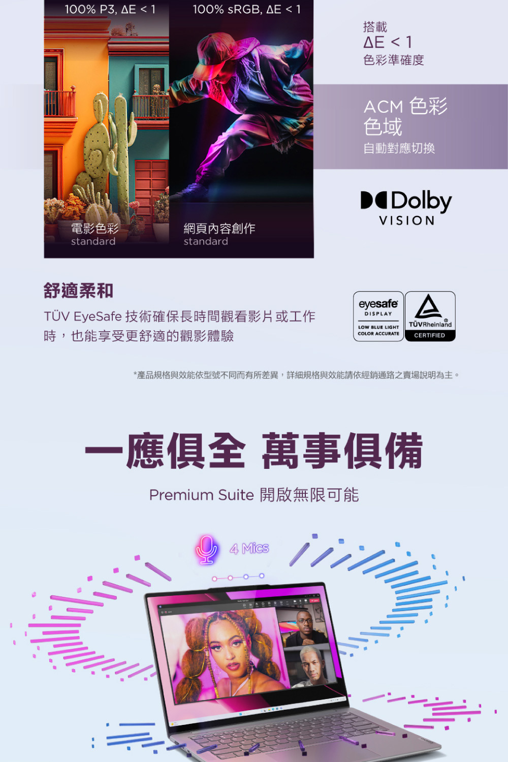 ●螢幕:14.5" 2.8K WQXGA+ (2880x1800) OLED 400nits Glossy, 100% P3, 100% sRGB, 120Hz, Eyesafe®, Dolby Vision®, DisplayHDR™ True Black 500, AGC Dragontrail™ Glass