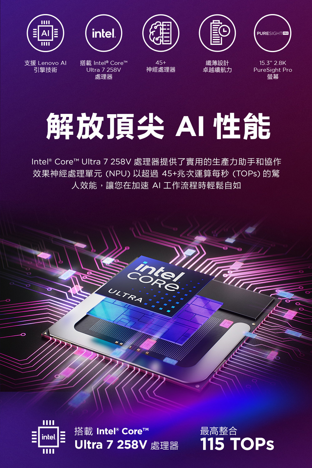 ●處理器:Intel® Core™ Ultra 7 258V, 8C (4P + 4LPE) / 8T, Max Turbo up to 4.8GHz, 12MB