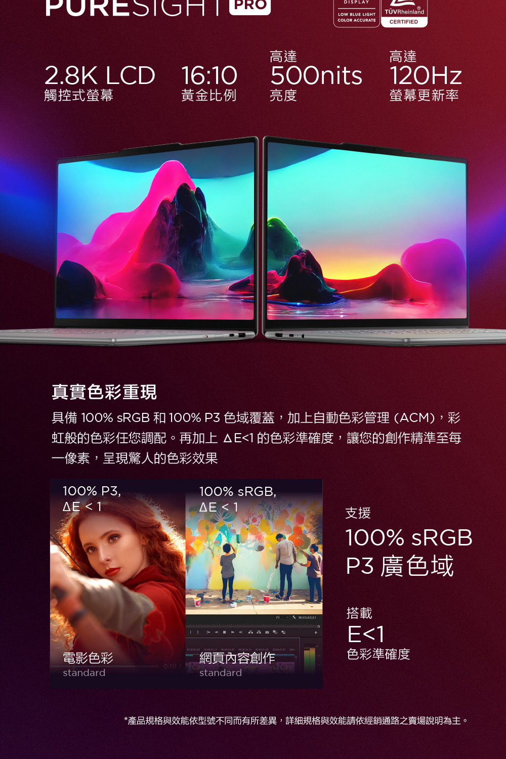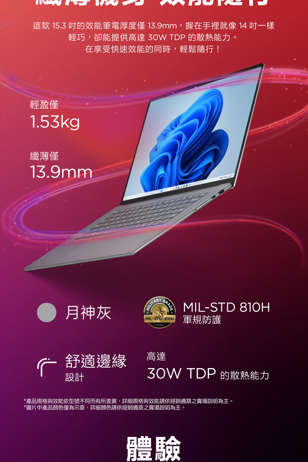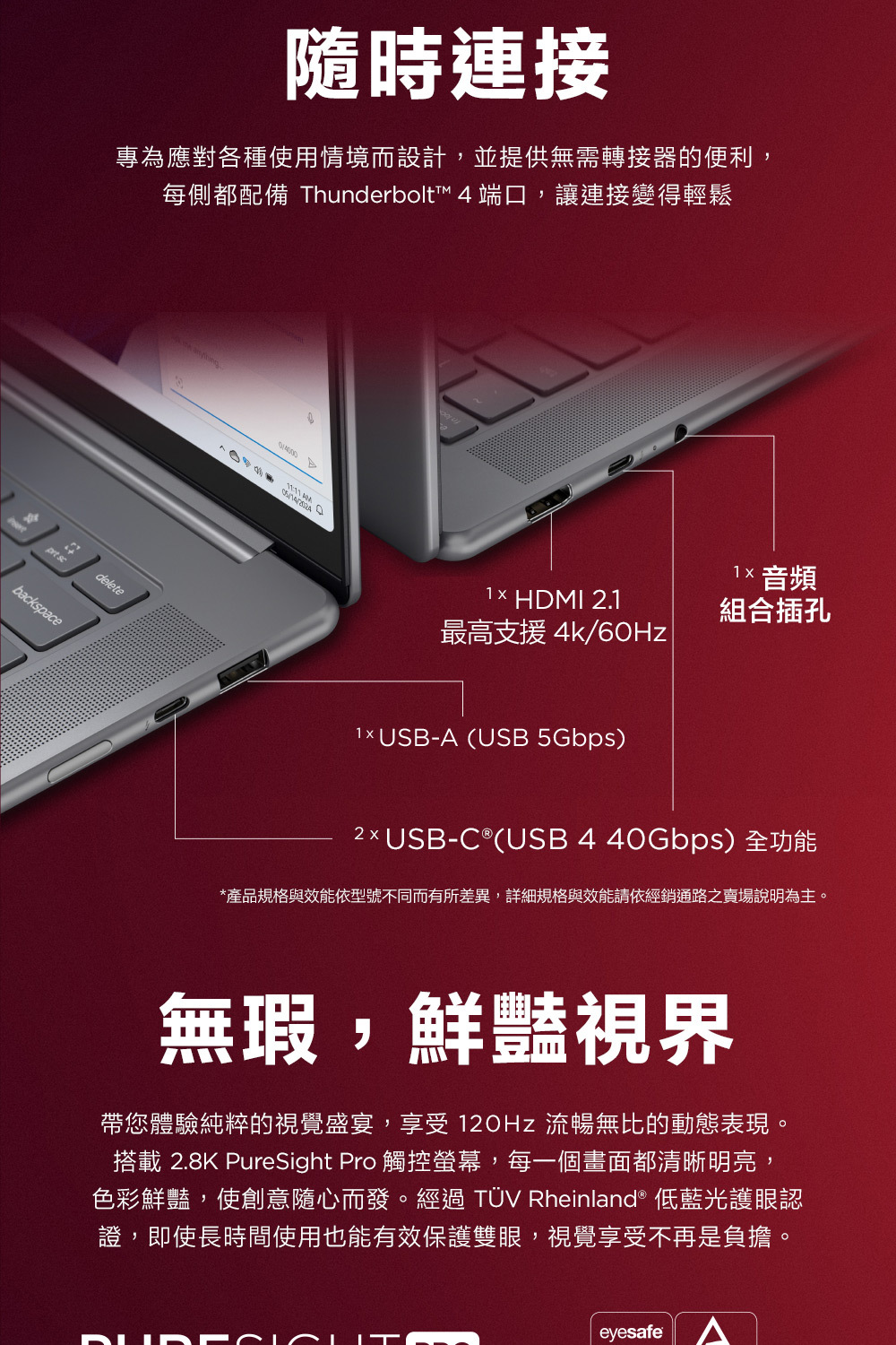 ●螢幕:15.3" 2.8K WQXGA+ (2880x1800) IPS 500nits Glossy / Anti-fingerprint, 100% DCI-P3, 100% sRGB, 120Hz, Eyesafe®, Dolby Vision®, DisplayHDR™ 400, Glass, Touch
